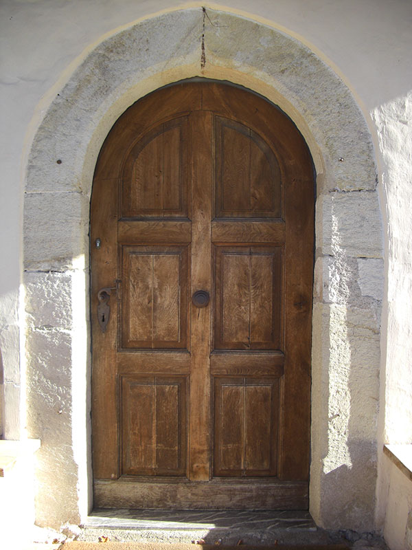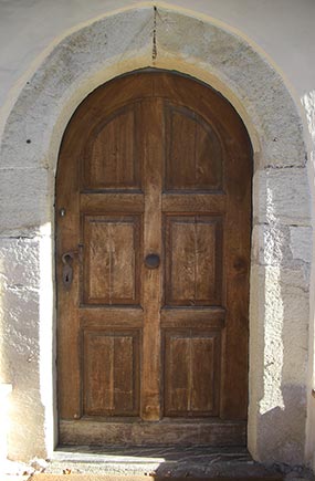 in legno di abete piallata a mano con chiodi ribattuti e inferriata antica nella parte superiore.